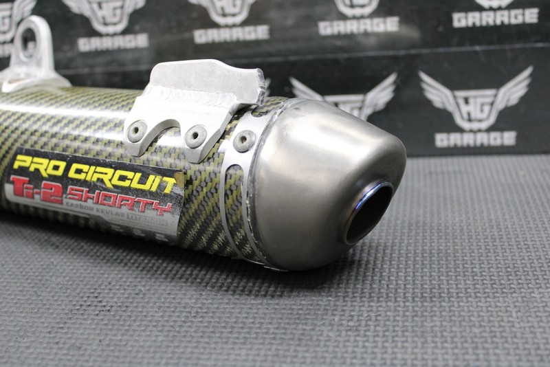 This Pro Circuit Ti-2 shorty muffler is being sold for parts or repair. The front mount is broken off as shown and the rivets on the rear of the canister are slighly loose and the midpipe wiggles. Overall in good shape and could be repaired or great for parts. Please see photos for complete condition.