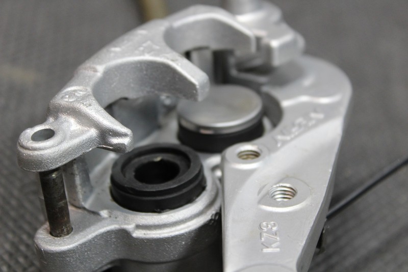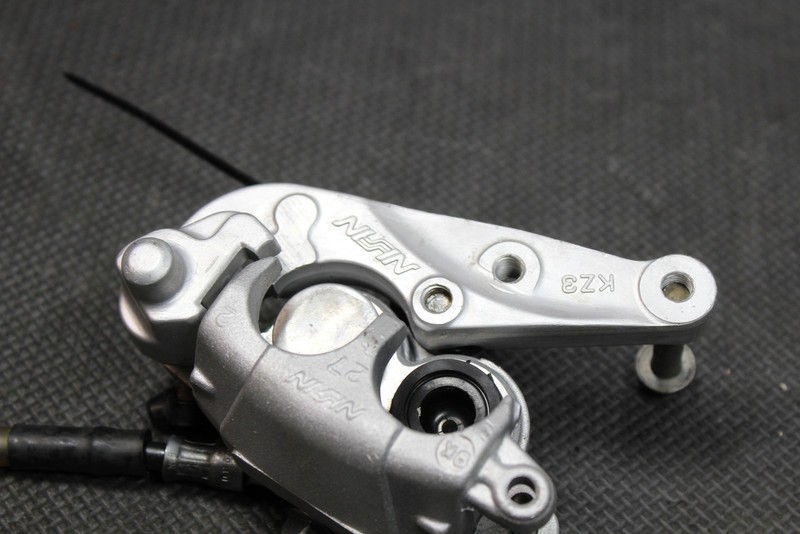 This front caliper is in good condition and shows normal signs of wear. No cracks, or leaks. One piston is missing top cap as shown. No brake lever or pads included, and will need to be replaced in order to run. Caliper piston seals appear to be coming apart, and is Recommended caliper be rebuilt before installed for optimal performance. Can be ran as is with just replacing pads, and lever.