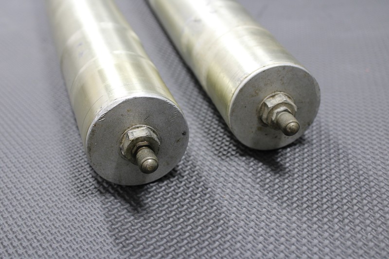 This front fork set is in decent condition and shows normal signs of wear. Forks cycle smoothly, but have poor rebound damping. Fork seals are leaking. Lower tubes have some wear and pitting as shown. Fork lugs in good shape with all threads intact. Upper tubes in good shape with no deep pitting or scratches.