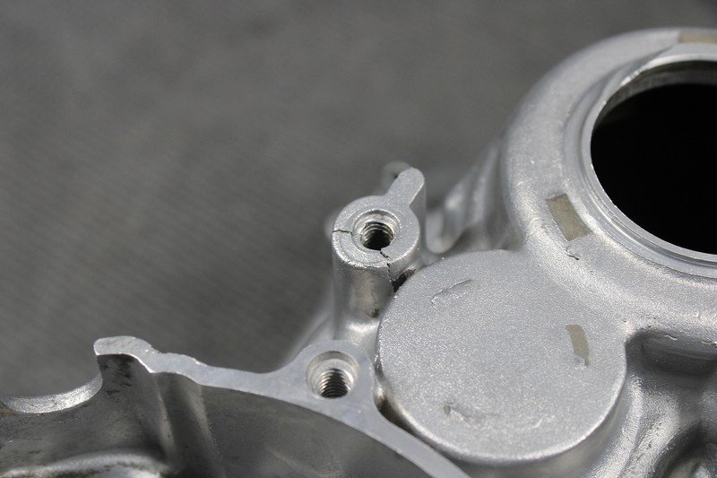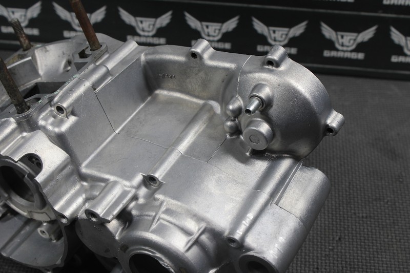 This crankcase is in very good condition and shows normal signs of wear. Top sprocket cover threaded tab is cracked as shown, still intact, and threads properly. No other cracks seen when inspected. All sealing surfaces in great shape. All threads function properly. Ready to assemble, and run.