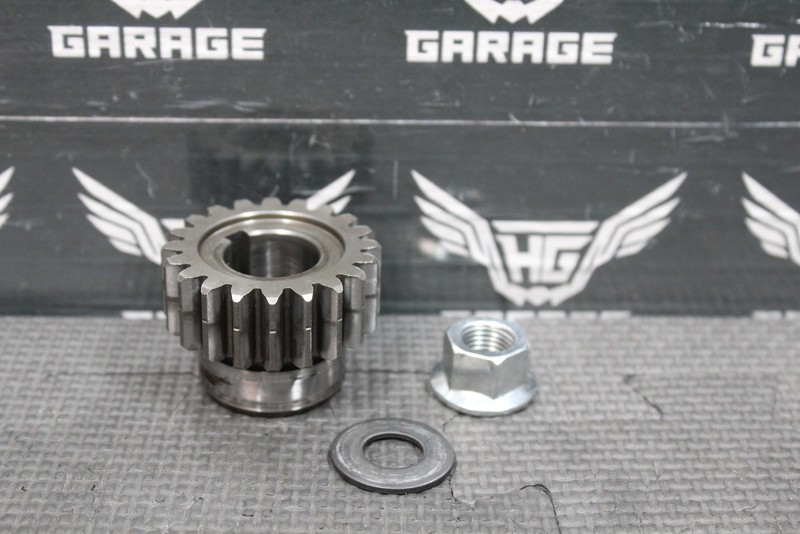 This primary gear is in good condition and shows normal signs of wear. No cracked or chipped teeth. All hardware and threads intact. Ready to install and ride.