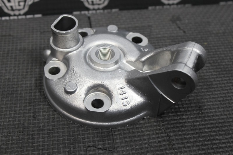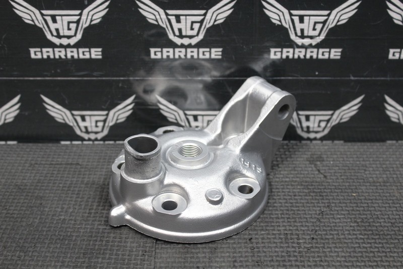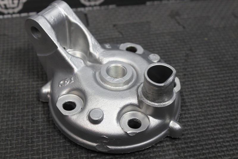 This cylinder head cover is in good condition and shows normal signs of wear. No cracks, welds, or leaks. Cylinder head does have some slight detonation with raised nicks that should be smoothed down before installed. Radiator hose outlet has a small bend as shown, still seals properly when assembled, and does not effect performance. Ready to bolt on, and ride.