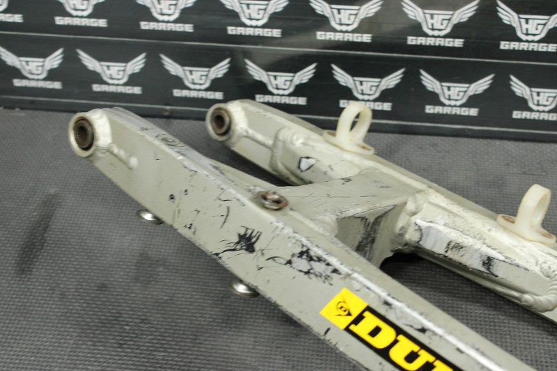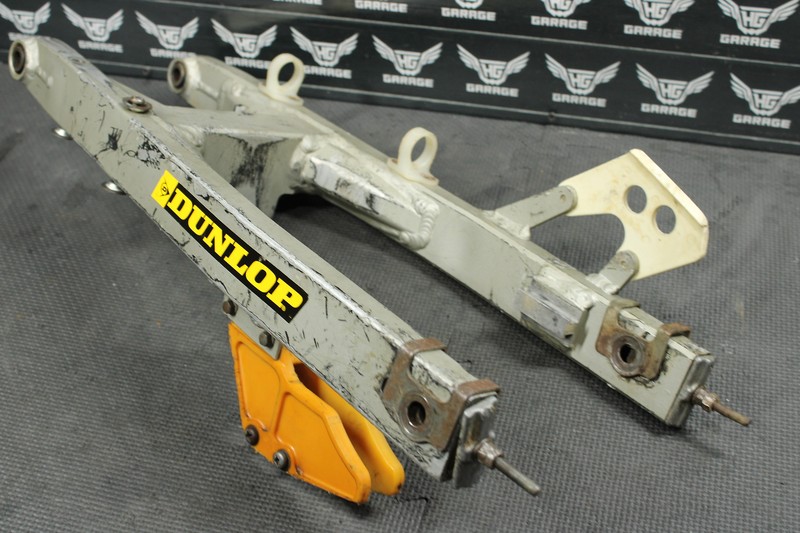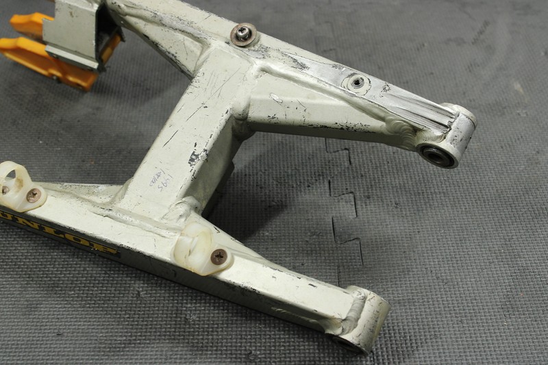 This swingarm is in very good condition and shows normal signs of wear. No cracks, breaks, or repairs. Has some minor chain wear, however is not through to bearing housing, and still seals properly. Has some scratches, and scuffs. Bearings rotate freely, however feel dry, and should be greased, or replaced before installed.