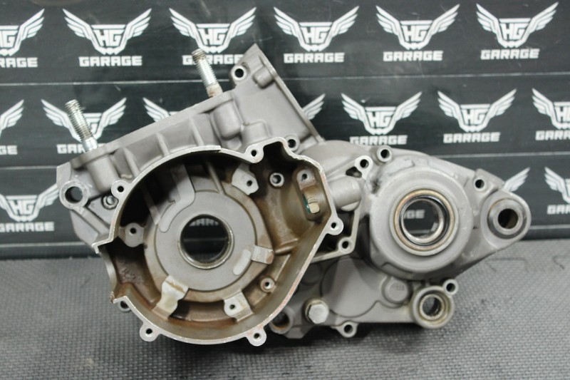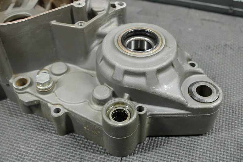 This left crankcase shows normal signs of wear. There is a single visible crack on the ignition cover sealing surface, as shown in the photos. While it may function as-is, we recommend repairing it prior to installation to ensure a proper seal. No other cracks. All threads are intact.