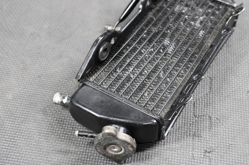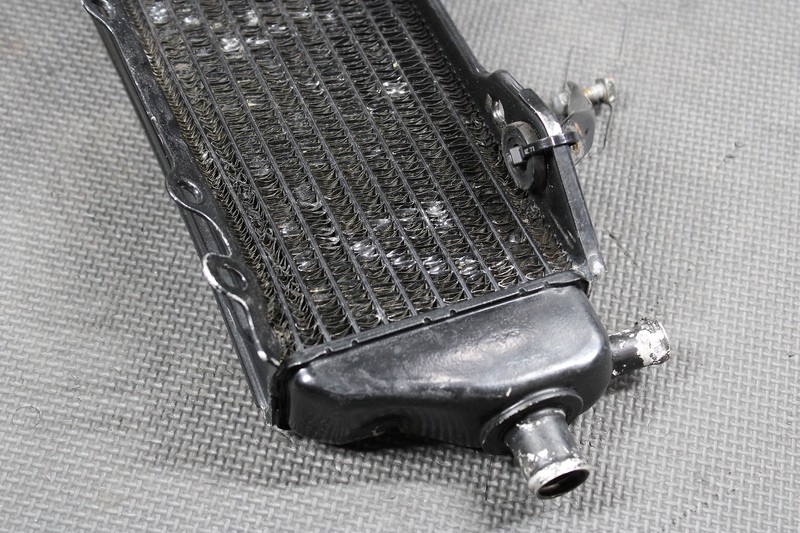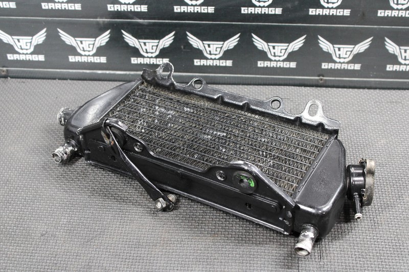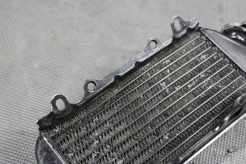This right radiator is in very good condition and shows normal signs of wear. Has one small bend as shown, does not effect how it mounts, and bolted up with no issue. No cracks, welds, leaks, or repairs seen when mounted. Ready to install and ride.