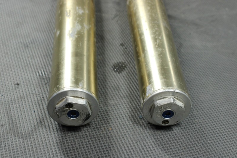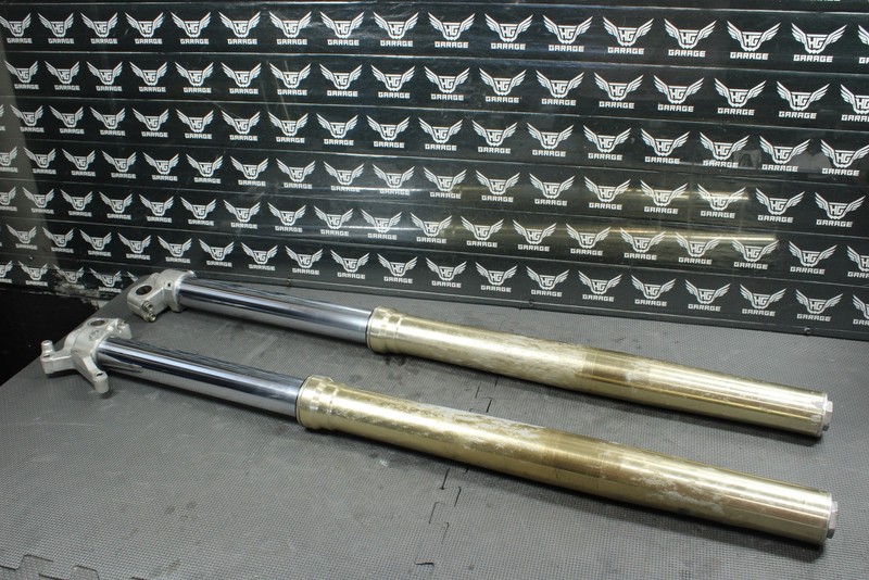 This front fork set is in fair condition and shows some minor signs of wear. Both forks cycle well with good rebound dampening. When tested seals appeared to wheep lightly, and is recommended both forks be serviced before installed for optimal performance. Upper tubes have a decent amount of surface pitting/flaking as shown. Still mount in triples properly with no issues. Lower chrome on left fork has a minor scratch just above fork lug, cannot catch a nail and is very minor. No other scratches felt. All threaded holes intact. Ready to install.