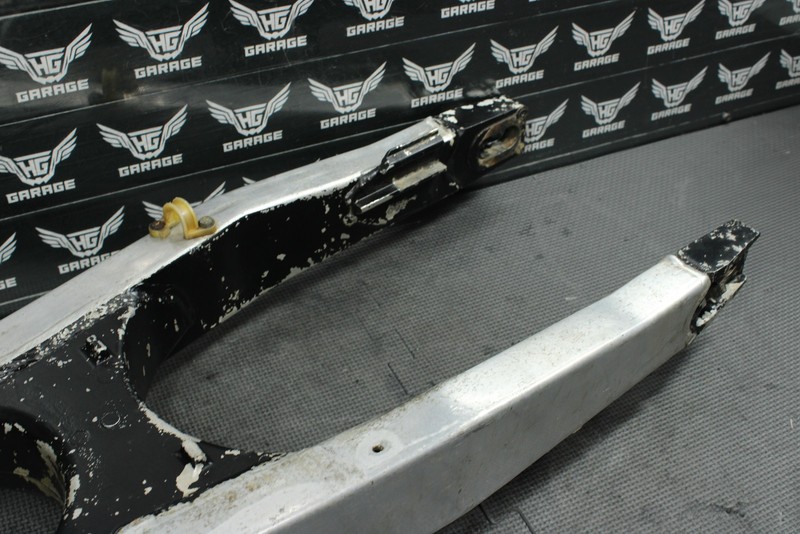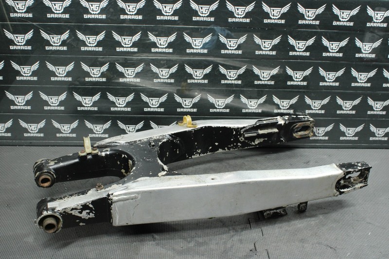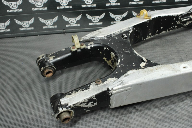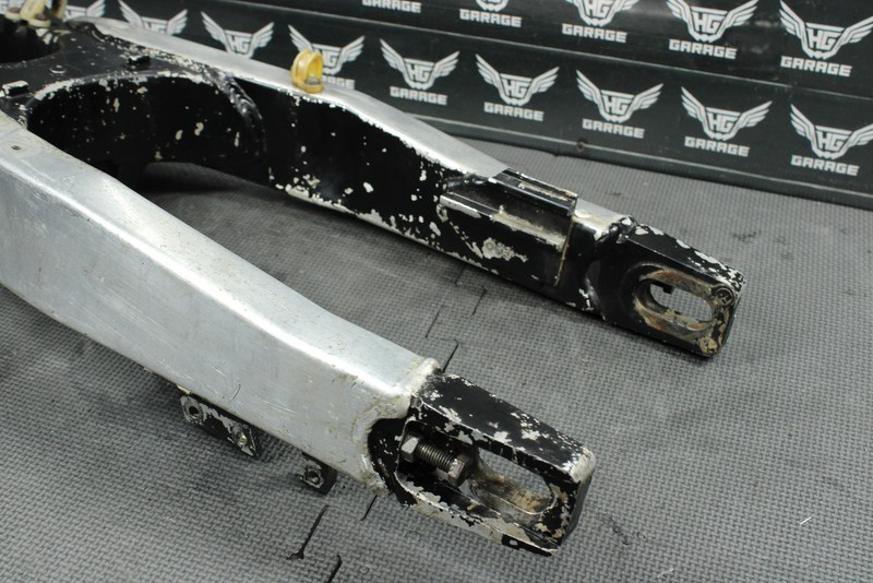 This swingarm is in poor condition, and has some damage as shown. Swingarm has a large piece broken off from chain wear as shown, and will need to be repaired/welded in order to be used. Has bee painted black. All threaded holes intact. Cannot be used as is, and will need work.