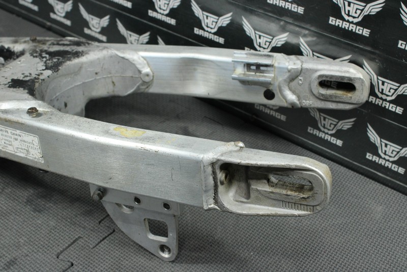 This swingarm is in fair condition and shows normal signs of wear. Swingarm has a decent amount of chain wear that has breached through to bearing cavitiy, and will need to be repaired/welded in order to seal properly. All bearings will need to be replaced. Cannot be used as is, and will need work before installed.