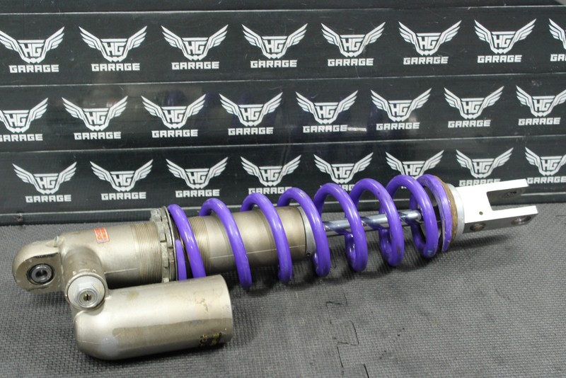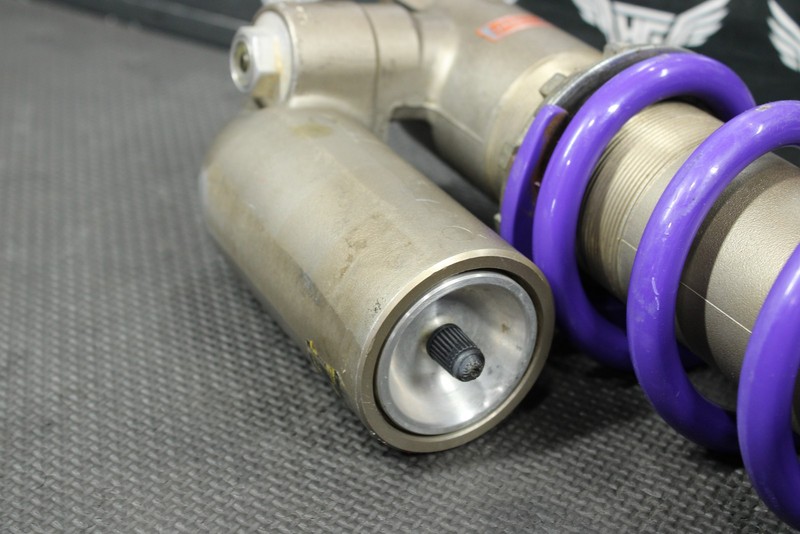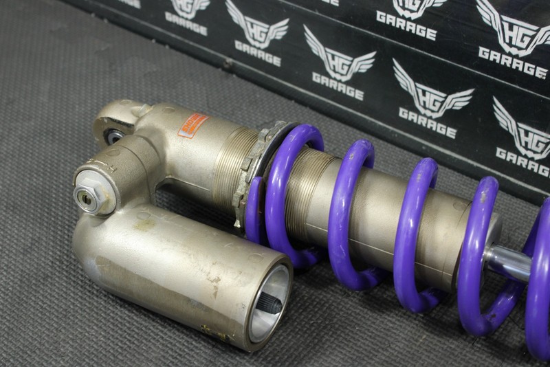 This rear shock is in fair condition and shows normal signs of wear. Poor dampening rebound when tested, seals leak, and shock will need to be fully serviced before installed in order to function properly. No deep scratches, or pitting felt on chrome shaft. Upper shock body in good shape with minor scratches. Cannot be installed as is, and will need work before installed.