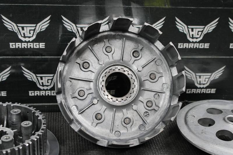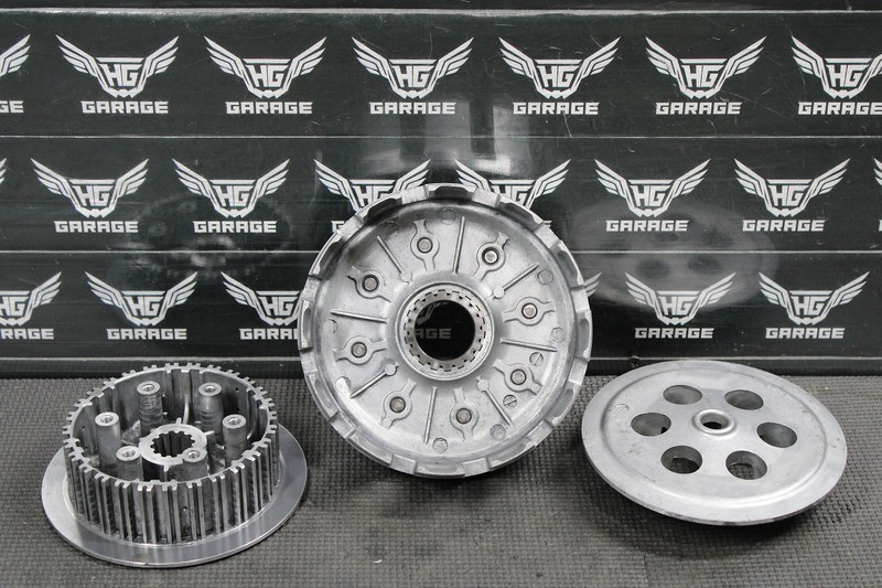 This complete clutch is in very good condition and shows normal signs of wear. No cracks, or repairs. Basket drive gear has some minor wiggle when tested, however nothing excessive, and is perfectly runnable. No excessive grooving, or wear. Ready to install, and run.