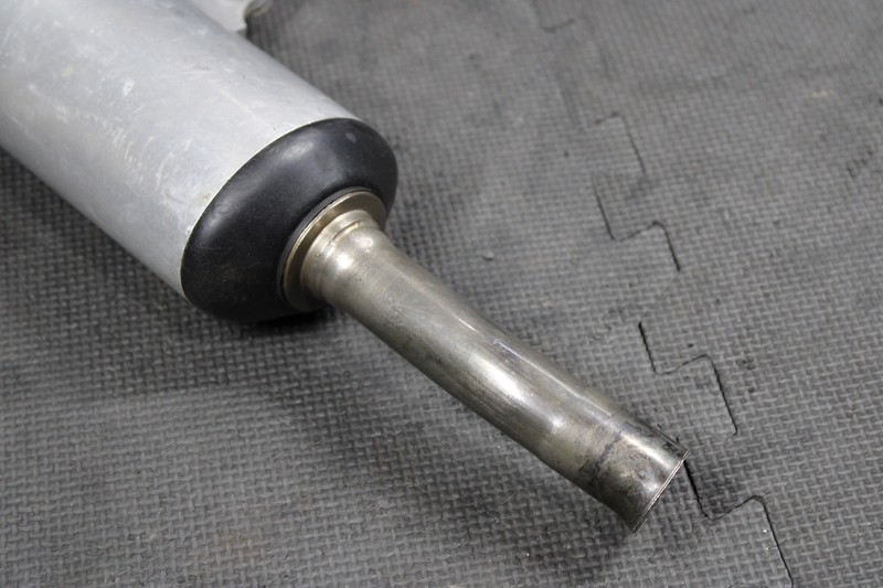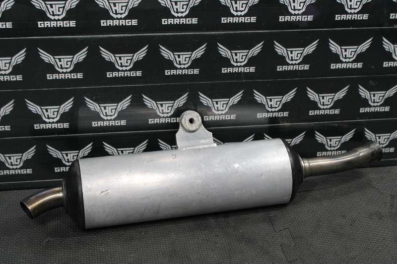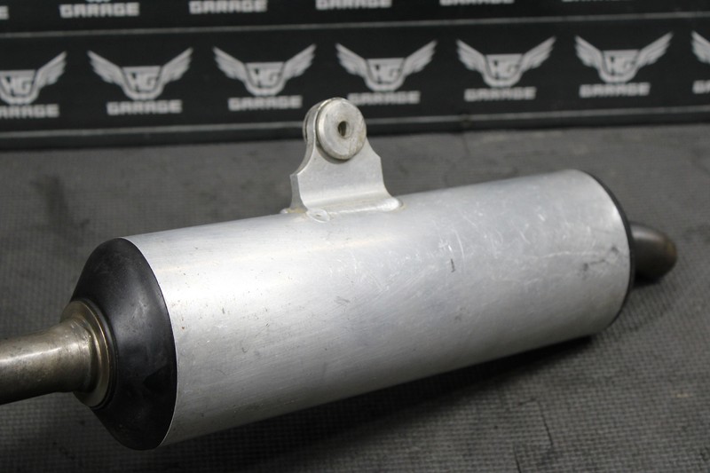 This muffler is in very good condition and shows normal signs of wear. No cracks, or breaks. Midpipe where header, and silencer meet is out of round as shown, and may need tweaking to slip on properly. Recommend repacking before installed. Ready to install, and ride.