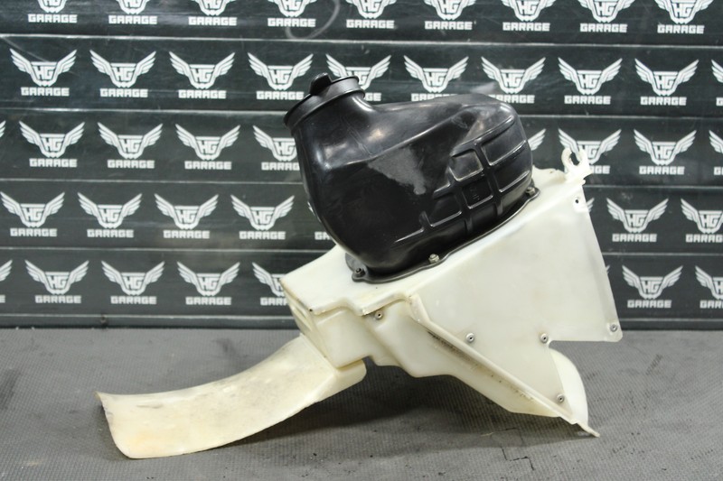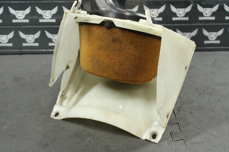 This airbox assembly is in very good condition and shows normal signs of wear. One mounting tab is cracked as shown, however still mounts properly with all other remaining tabs No cracks, or cuts in intake boot. Has some scratches, and minor scuffs from normal wear. Ready to install, and ride.