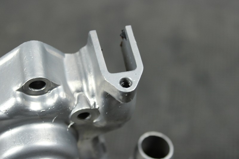 This inner clutch cover is in very good condition and shows normal signs of wear. No cracks, or repairs. threaded hole for powervalve actuator arm cover is stripped as shown, and will need to be repaired/ helicoiled. All other threaded holes fully intact. Ready to assemble, and run.