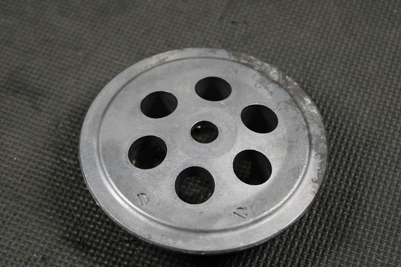 This clutch boss is in very good condition and shows normal signs of wear. Surface where friction plates ride has some minor surface corrosion from sitting on shelf as shown. No cracks, or excessive wear. One bolt for clutch springs is aftermarket, and still functions as it should. Ready to install!