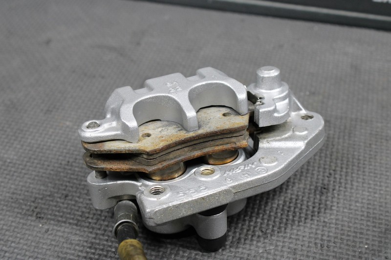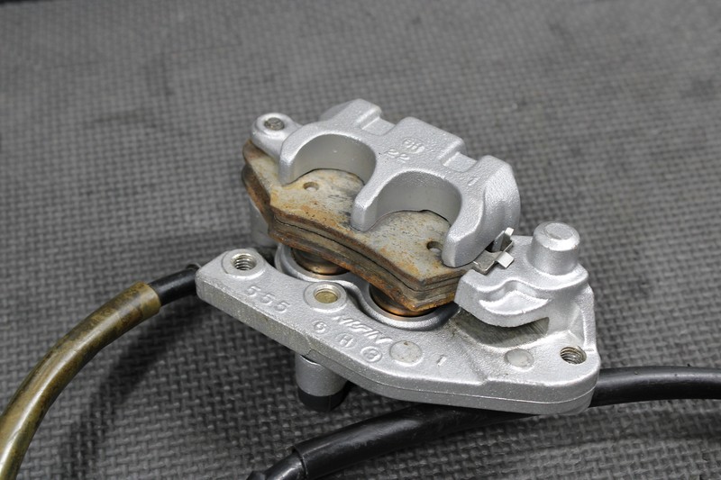 This front caliper is in very good condition and shows normal signs of wear. Brake functions, and builds pressure as it should. Master cylinder will need hardware, and dust seal replaced as shown. All threads intact. Ready to assemble!