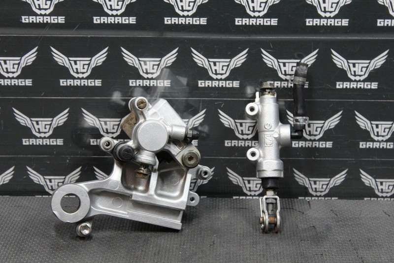 This rear brake assembly is in fair condition and shows normal signs of wear. Master cylinder does not build pressure and rubber boot is cracked. Piston has some minor pitting as shown. We reccomended that the caliper is rebuilt before installation or optimum performance. Ready to reassemble and ride.