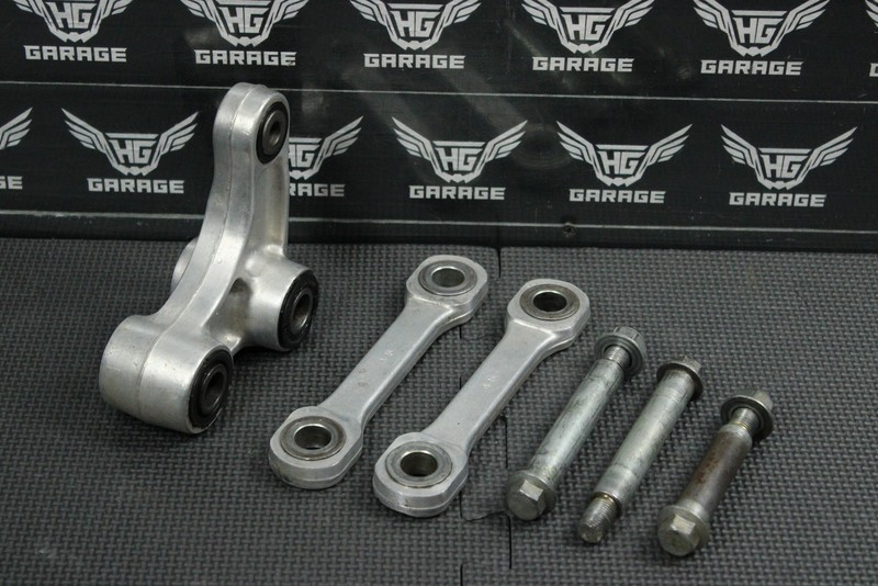 This rear shock linkage is in good condition and shows normal signs of wear. All bearings feel tight, and rotate freely. One of the linkage dog bones has some grind marks as shown, very minor and does not effect how it mounts, or pivots. Some light knicks, and scuff marks. Overall good functioning shape, and is ready to install.