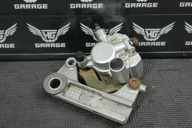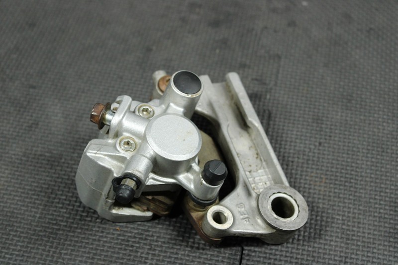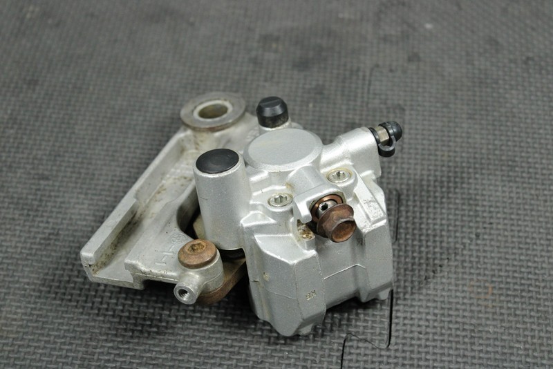 This rear caliper is in good condition and shows normal signs of wear. No cracks, or leaks. Nice functioning shape. All threaded holes intact. Slide pin bushings have a minor amount of wobble, however can be ran as is. Ready to mount, and ride.