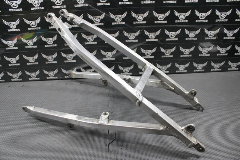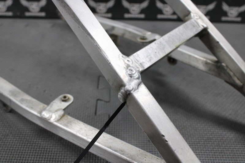This subframe is in pretty good condition and shows normal signs of wear. Has a welded repair as shown, however looks to be done well and subframe is solid with no cracks. Pretty straight with a slight tweak (see photo when mounted). All threaded holes and tabs are intact. Not perfect, but overall in good riding shape and functions as it should.