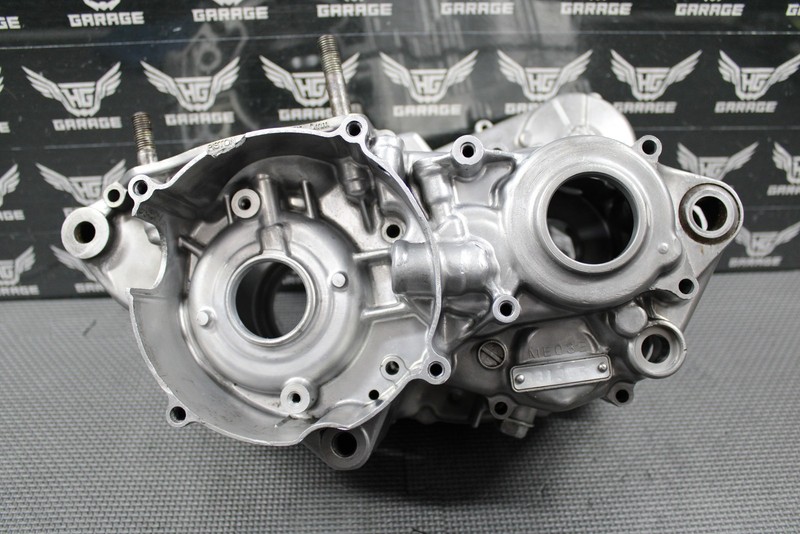 This OEM left and right crankcase set is being sold for repair only. The case set has a few issues that would need to be fixed prior to use. The main issue is the crank housing is cracked on both left and right side of the case as shown from a previous engine failure. There is also a chip in the stator housing area. A few of the sealing surfaces have some tool marks as shown. One of the bores for the shift fork shaft has a small hairline crack. Other then these issues, all other sealing surfaces, threaded holes and bearing bores are intact and there are no other cracks. The cases came out of a good running bike, however the cracks in the crankshaft housing had been sealed with JB weld to prevent an air leak. We chipped off the JB weld to expose the issues. Overall fairly solid set of cases that would be a good candidate for repair.