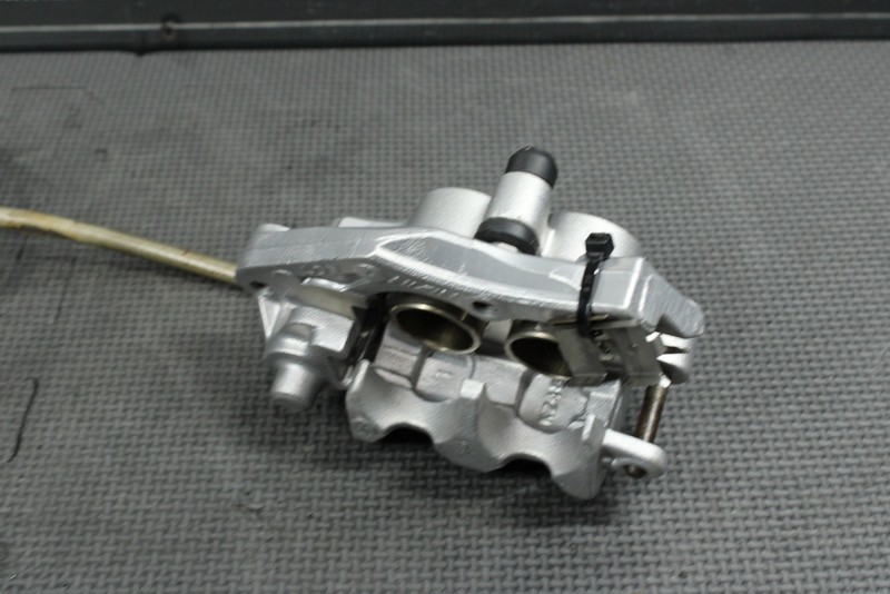 This front caliper is in very good condition and shows normal signs of wear. No cracks, or breaks. Fully functional. Brake pads have been removed, and will need to be replaced. Ready to assemble, and ride.