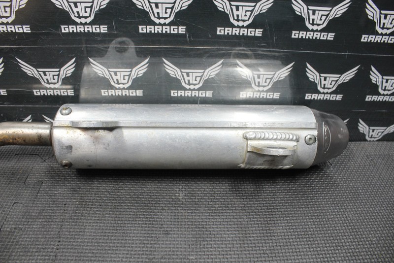This FMF muffler is in good condition and shows normal signs of wear. Muffler midpipe has a crack as shown, and does leak when running. Is highly recommended it be repaired before installed. Mounts as it should. No other cracks, or breaks seen when inspected. Can be ran as is, however is not recommended, and muffler should be repaired/welded before installed in order to seal properly.