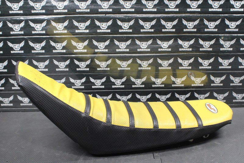This seat w/ JFG Racing seat cover is in good condition and shows normal signs of wear. No rips/tears in seat cover. Left rear mounting tab is broke, and has been repaired with a makeshift tab as shown. Still mounts as it should. Ready to bolt up, and ride.