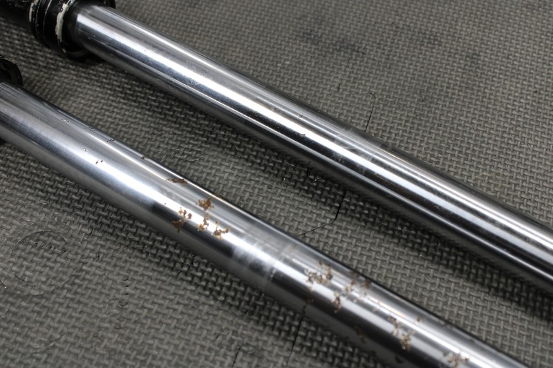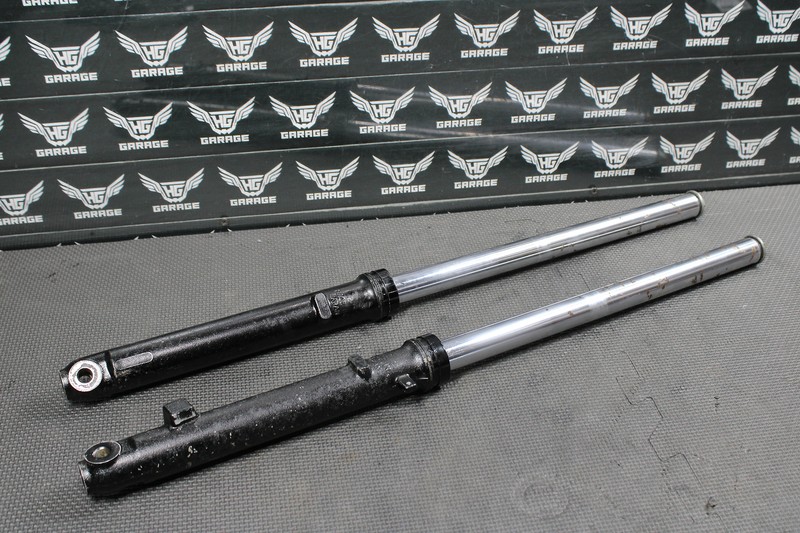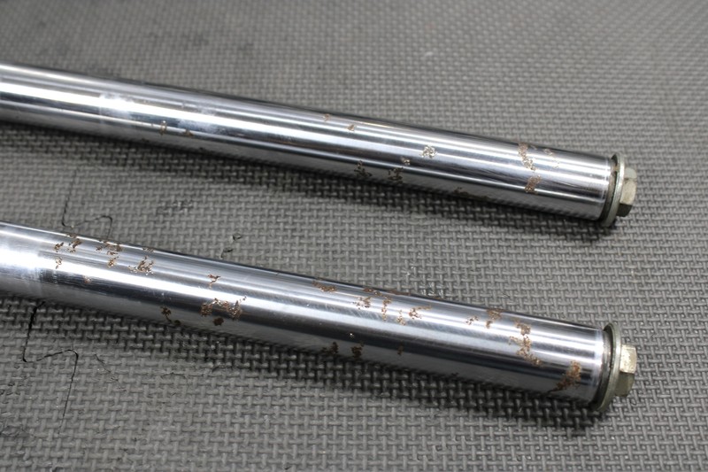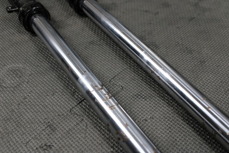 This front fork set is in very good condition and shows normal signs of wear. Seals leak, and both forks have poor dampening, and rebound. Have some decent pitting, and surface corrosion on the upper chrome shafts as shown where seals ride. No deep gouges or scratches. Lower tubes in decent shape some minor scratches, and scuffs. Good for parts or repairs. Sold as non functioning, will need work in order to function properly.