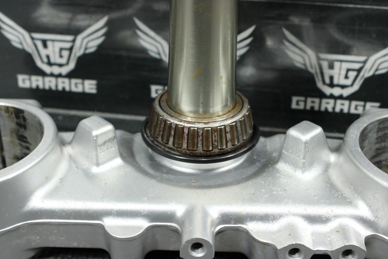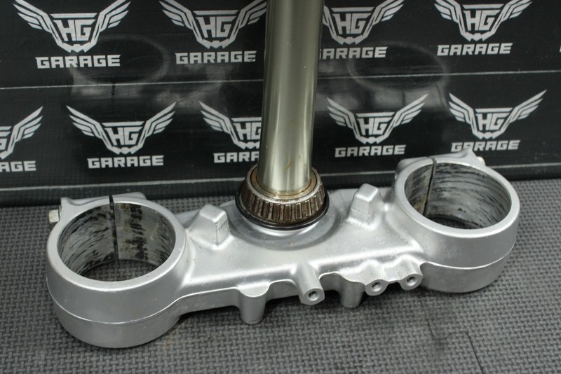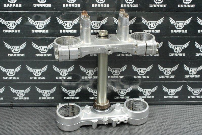 This triple tree set is in very good condition and shows normal signs of wear. No cracks, welds, or repairs. All threaded holes intact. Bearings will need to be replaced, along with some hardware that is missing as shown in photos. Will need work before installed, and cannot be ran as is.