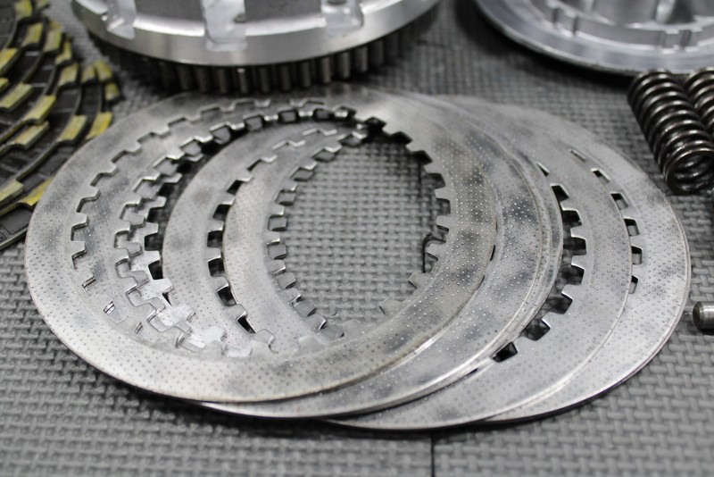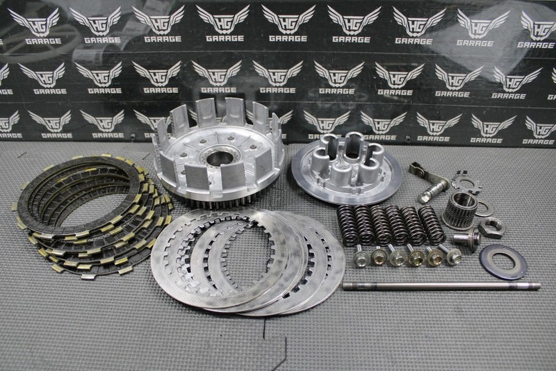 This OEM clutch assembly (complete minus center hub) is in decent condition and shows some signs of wear. Removed from a good running and shifting machine. Basket has some grooving starting as shown, but has not been filed down yet Plates and steels have decent life left and did not slip. Ring gear is pretty tight with a very small amount of play. Comes with all hardware as shown. Decent running shape as is, but recommend filing basket.