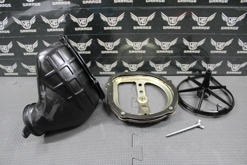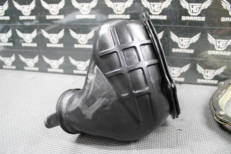 This air cleaner parts lot is in good condition and shows normal signs of wear. Intake boot in good shape with no rips or tears. Comes with filter cage and airbox hardware as shown. Good running shape. Missing one nut for the metal cage mounting plate.