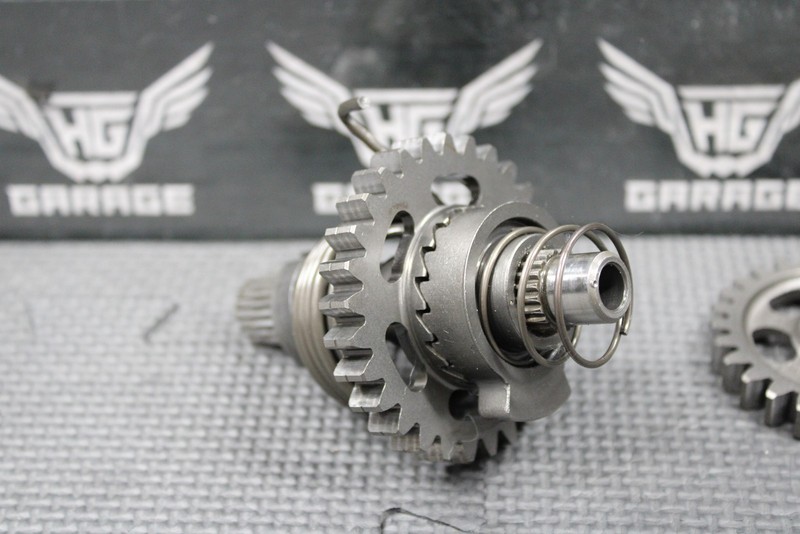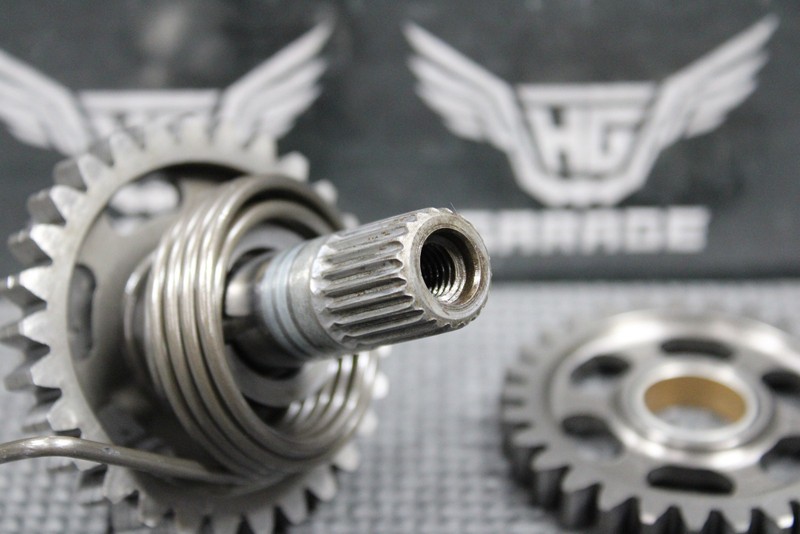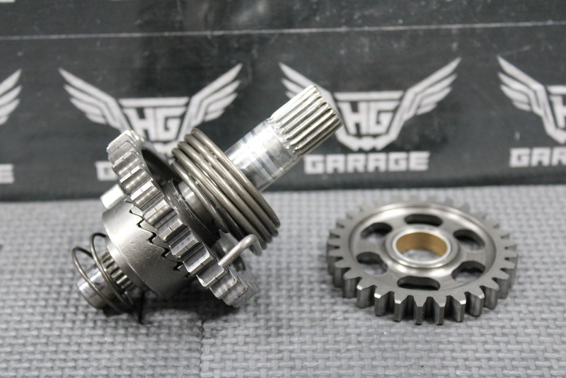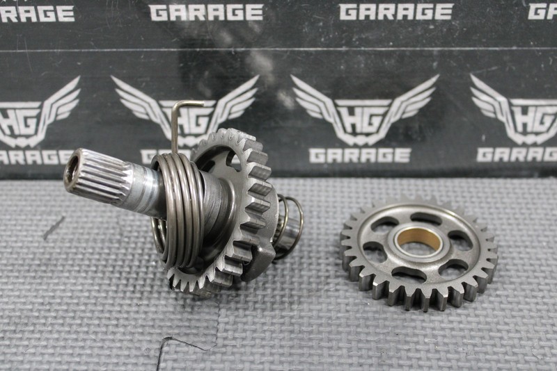 This kickstart gear with shaft is in good condition and shows normal signs of wear. Good functional shape. All splines and threads are intact.