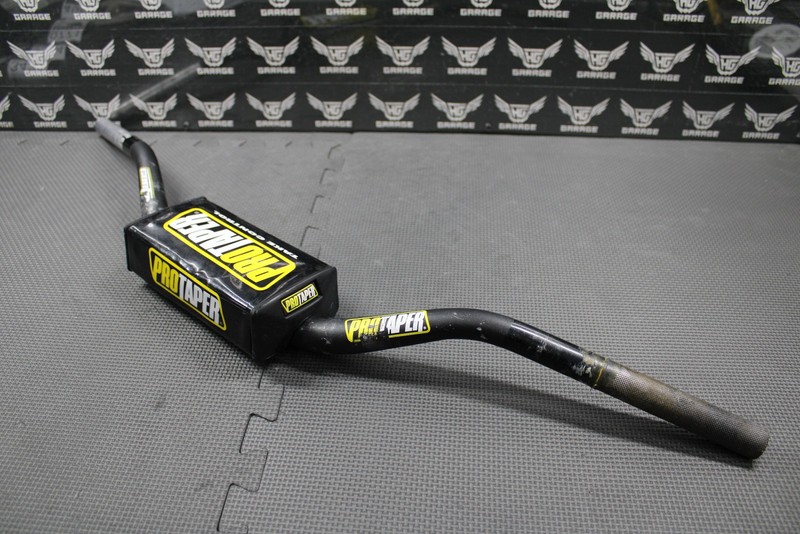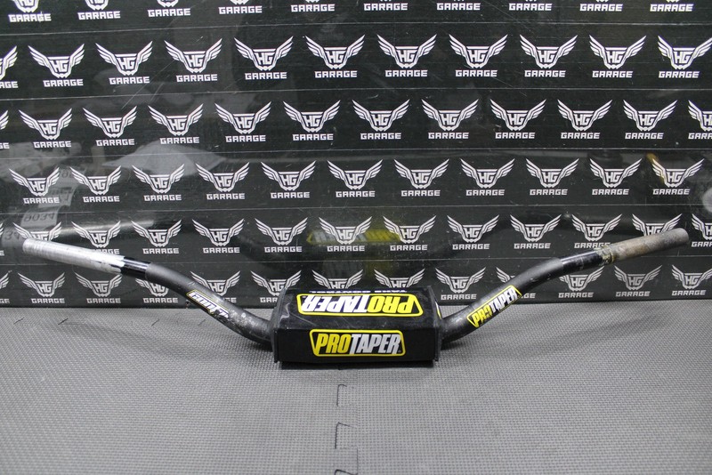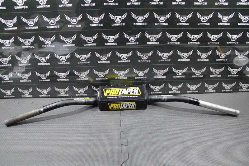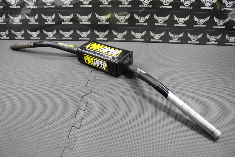 This Pro Taper CR High fat bar handlebar is in good condition and shows normal signs of wear. Nice and straight. Bar pad in good shape with no rips (missing one of the PT logos on one side as shown). Requires 1-1/8" fat bar clamps. Good riding shape.