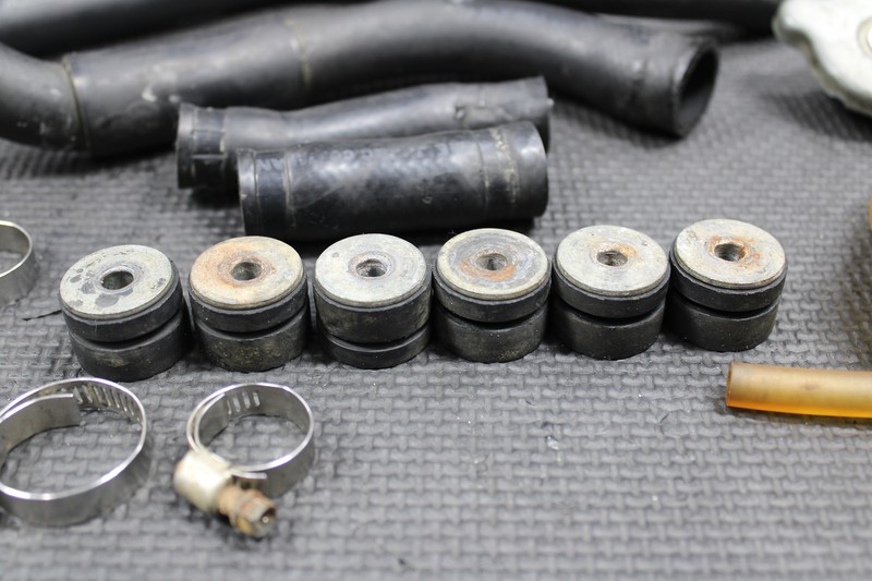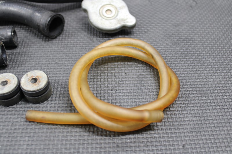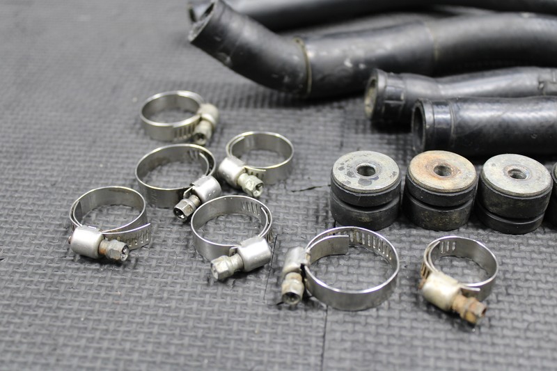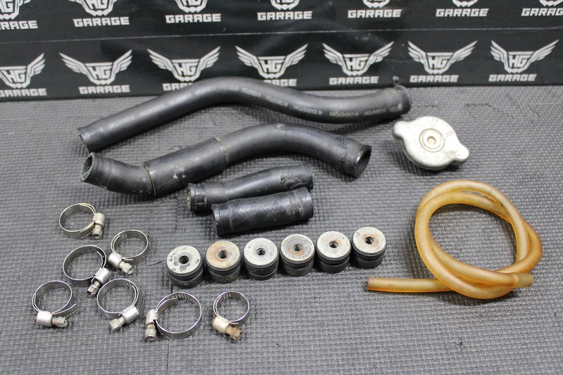 This radiator hardware set is in very good condition and shows normal signs of wear. No leaks. OEM hoses are intact with one or two small abrasions, but no holes. Comes with everything as shown. Not a complete set of hose clamps, but includes the majority.
