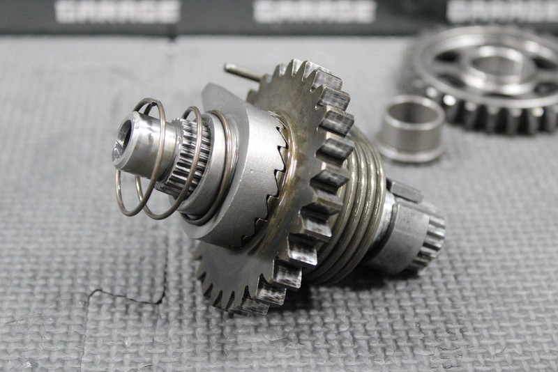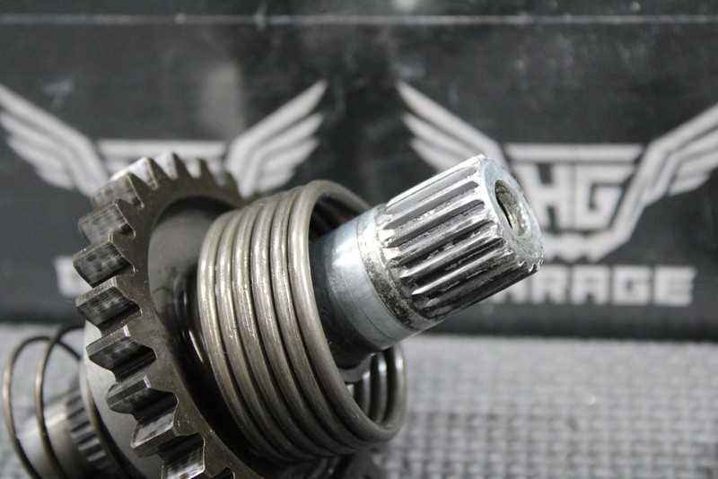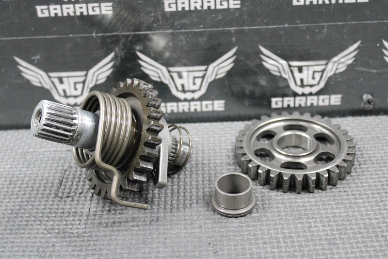 This kickstart gear with shaft is in good condition and shows normal signs of wear. Fully functional assembly. Splines and threads are intact. Good running shape.
