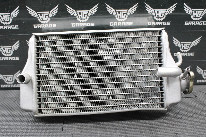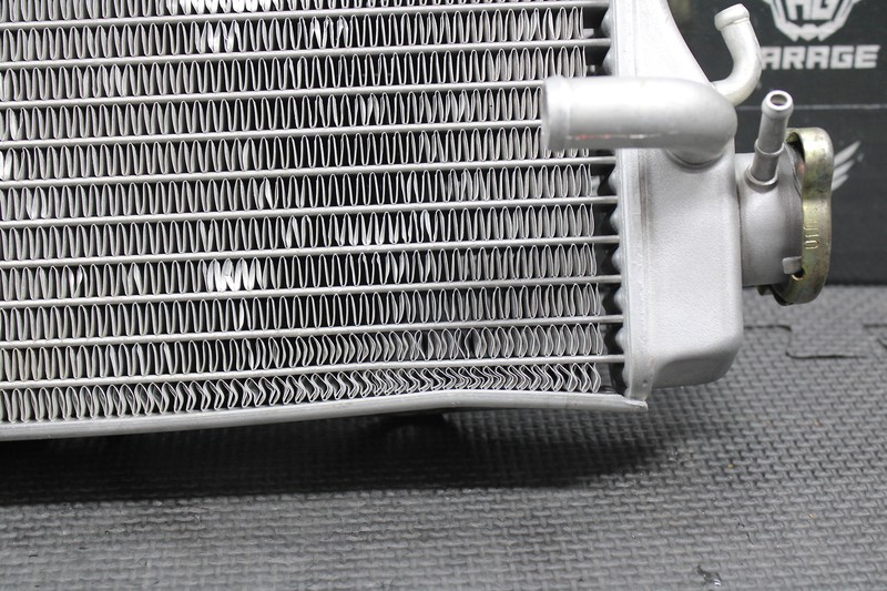 This OEM right radiator is in very good condition and shows normal signs of wear. No leaks. Pretty nice and straight with one small bend as shown. Mounts up nicely and functions well.