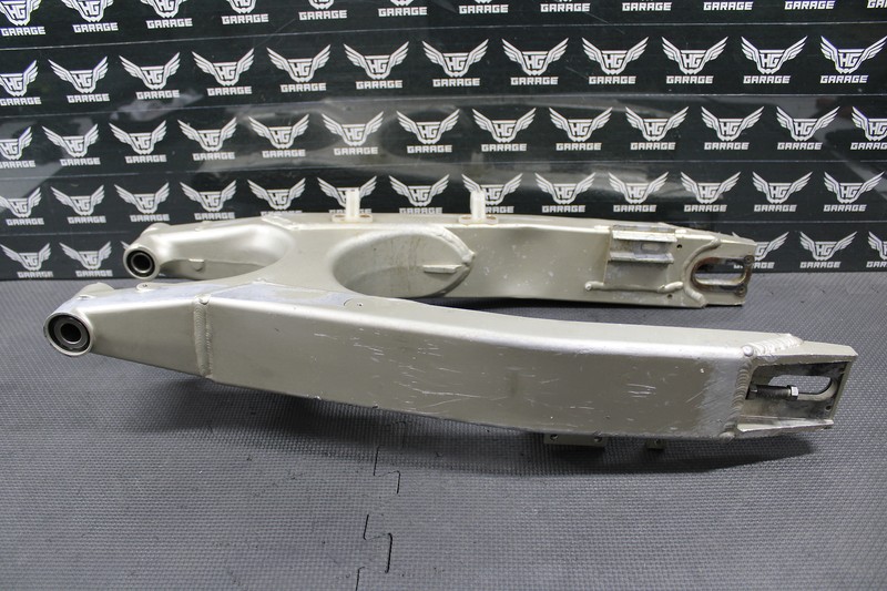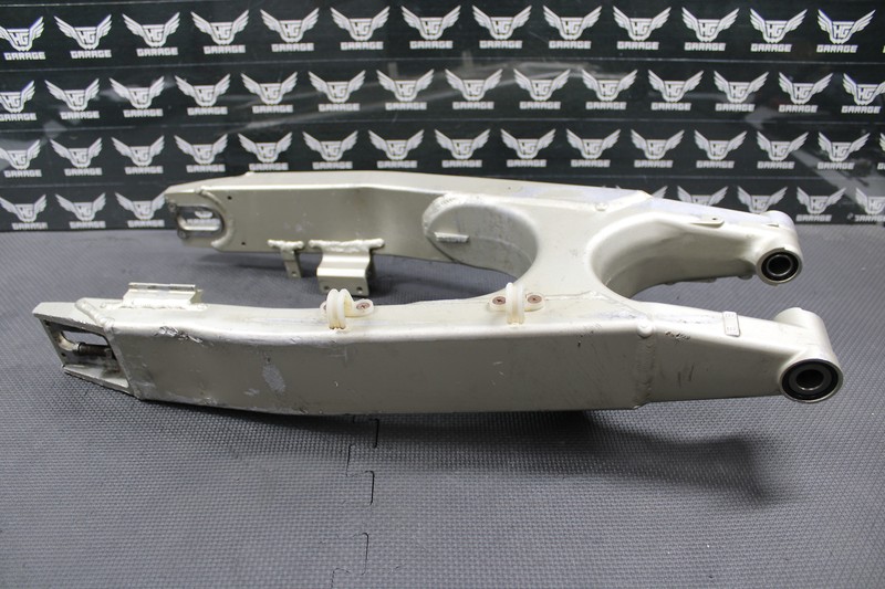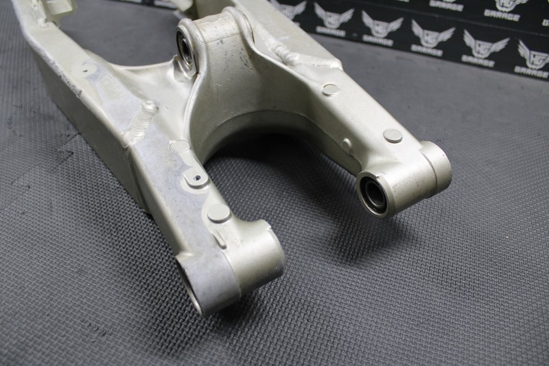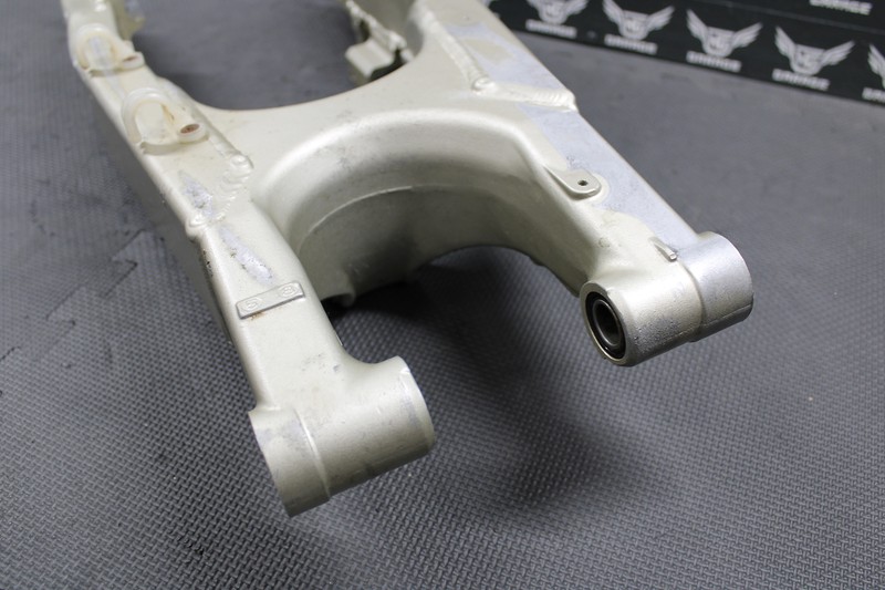 This swingarm is in good condition and shows normal signs of wear. No cracks or severe damage. Removed from a good riding bike. Has a decent dent on the right chain stay as shown. Left bearing turns freely, right bearing is fairly tight and may need to be replaced. Bottom pivot bearing is tight and may need to be replaced as well. Chain adjuster bolts thread in and out with no issues. No chain wear in the common areas.