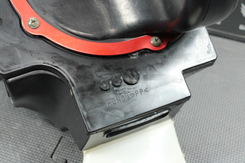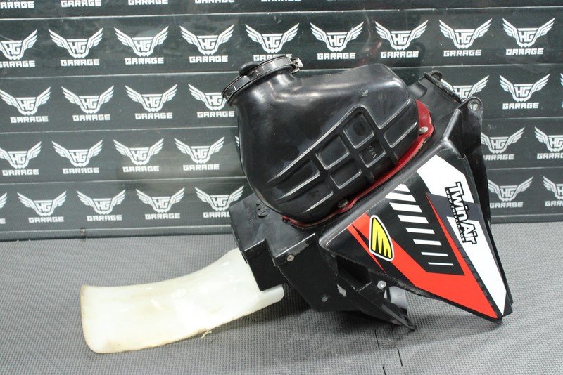 This airbox assembly is in good condition and shows normal signs of wear. Both lower connecting rivets have been replaced for airbox case as shown. One tab is cracked, however still holds as should. Mounts, and functions properly. Ready to bolt on, and ride.