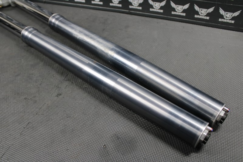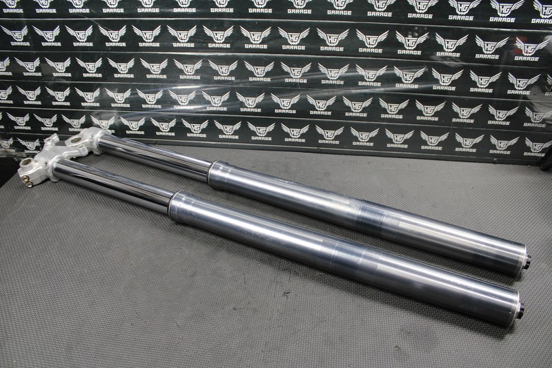 This front fork set is in good condition and shows normal signs of wear. Forks cycle smoothly, however damping is fairly poor due to low oil in the forks. Seals and oil will need to be serviced for optimal performance. Clickers all turn and "click". No scratches or pitting on lower chrome tubes. Lugs in good shape with all threaded holes intact.