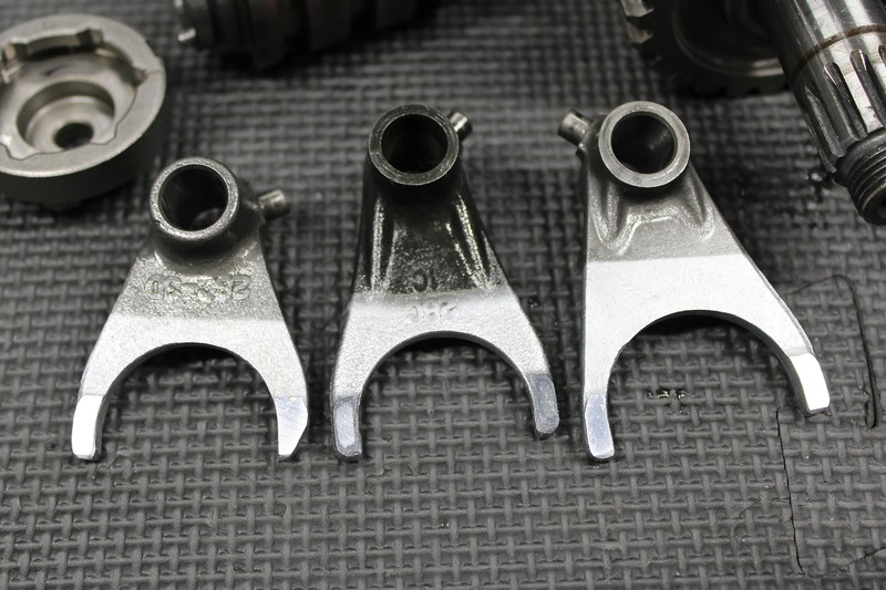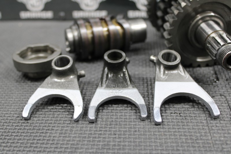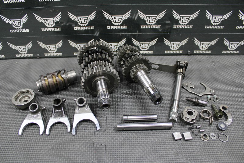 This transmission is in very good condition and shows normal signs of wear. Great running and shifting condition. No chipped or broken gears. Shift forks and dogs in good shape with no excessive wear or issues. Complete transmission ready to drop in and ride!