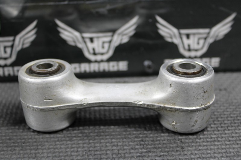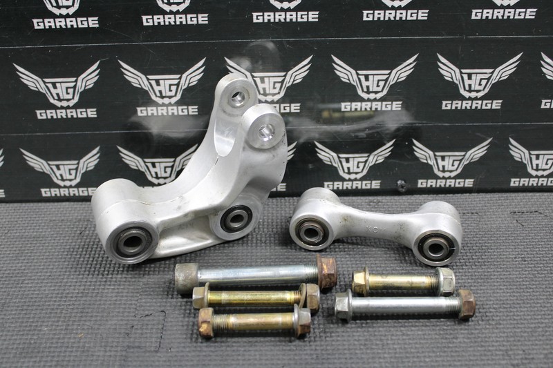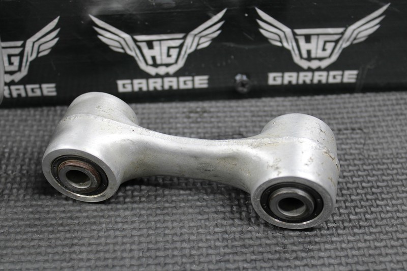 This rear shock linkage is in very good condition and shows normal signs of wear. All bearings turn freely and are in good shape. Includes all bolts for the linkage as shown as well as upper and lower shock bolts. No cracks or damage.