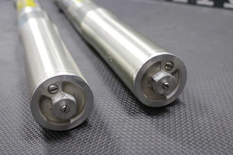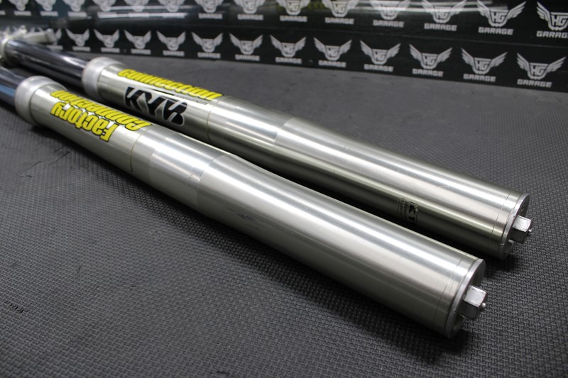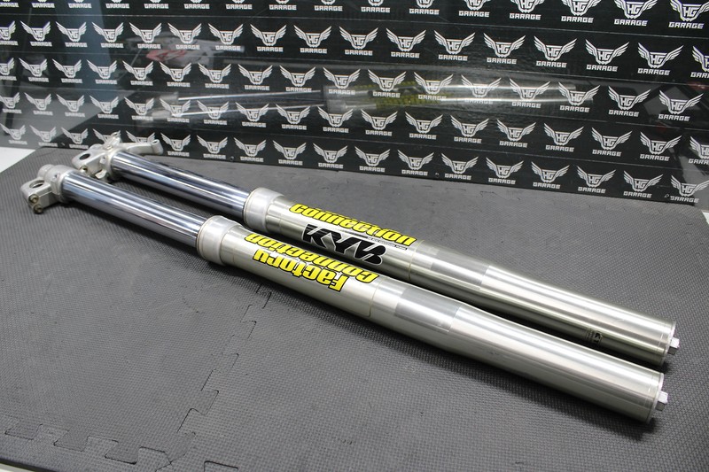 This front fork set is in great condition with minor wear. Very nice clean set of KYB OEM Forks. Forks cycle smoothly with good damping. Clickers function. Seals are weeping slightly and should be serviced for optimal performance. No damage or issues. Fork lugs in great shape with all threaded holes intact. Lower chrome tubes in great shape with no scratches, pitting or excessive wear. Upper tubes are very clean and in great shape with a couple very small rub marks as shown. These forks were setup for a 120lb MX rider by Factory Connection a few seasons ago and I believe they have lighter springs installed. Very nice set of OEM forks.