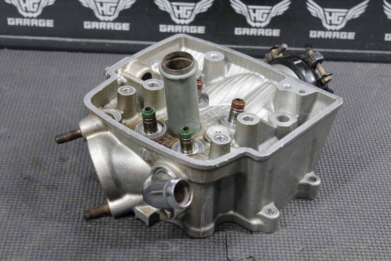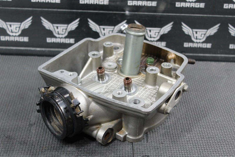 This cylinder head is in fair condition and shows some signs of wear. Head has some pitting in the combustion chamber, and some around gasket mating surface as shown, and will need to be surfaced in order to seal properly. All 4 valve seats intact with no cracks or chips, but do have pitting and is recommended all be replaced before installed for optimal performance. All threaded holes fully intact. Cannot be ran as is, and will need a good amount of work in order to run.
