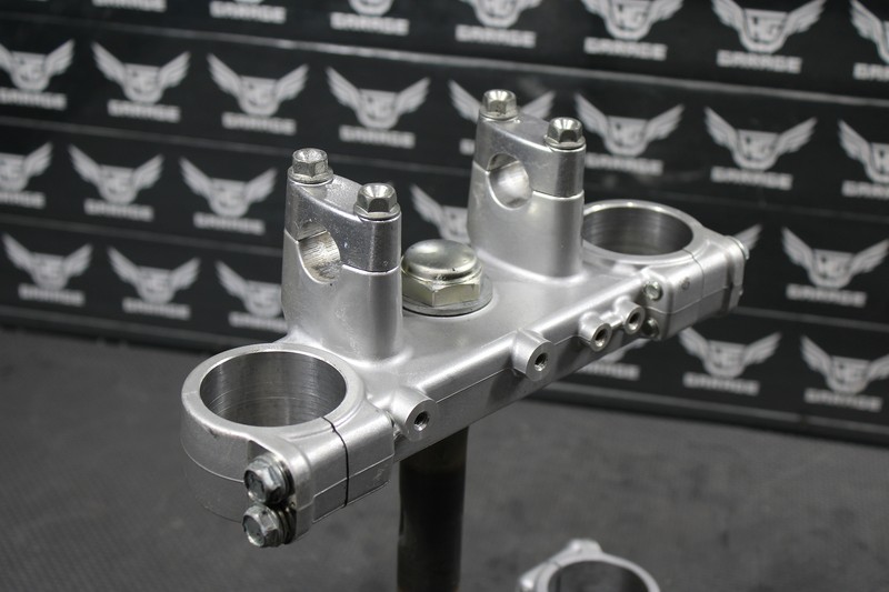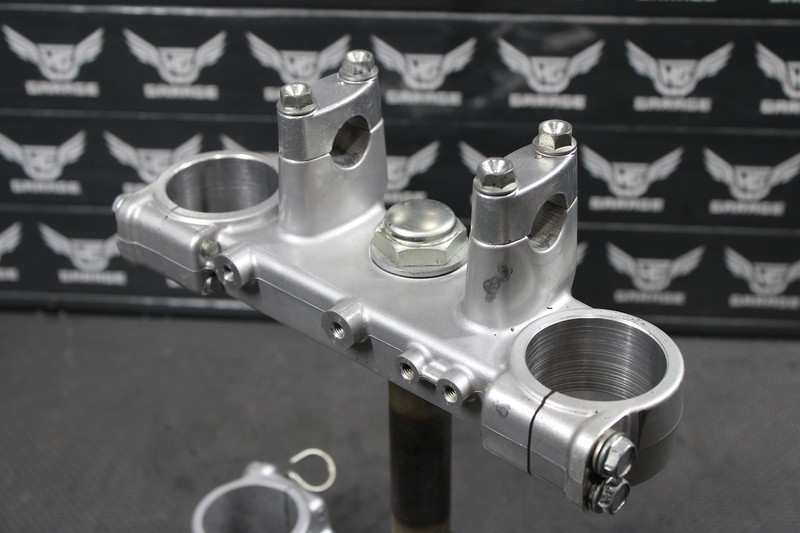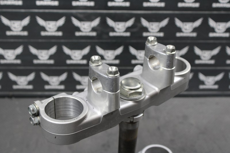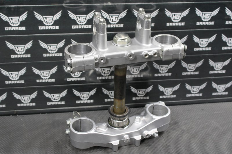 This triple tree set is in very good condition and shows normal signs of wear. No cracks, or repairs. front threaded holes on lower clamp is stripped as shown, and will need to be repaired/helicoiled in order to thread properly. All other threaded holes fully intact and thread as they should. Bearings feel tight, and rotated freely when mounted. Ready to mount up and ride.