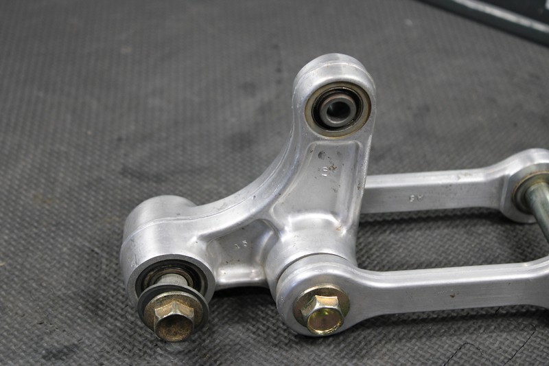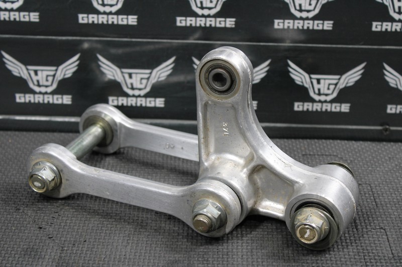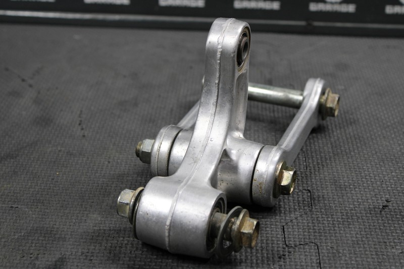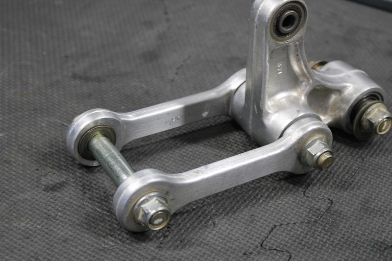 This rear shock linkage is in very good condition and shows normal signs of wear. All bearings feel tight and rotate freely. Recommend greasing before installed for optimal performance. No cracks, or bends. All hardware present and intact. Ready to bolt on and ride.