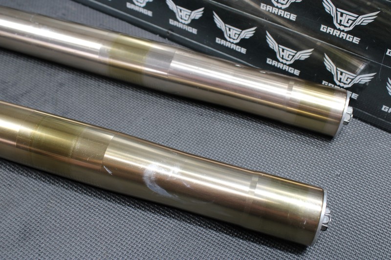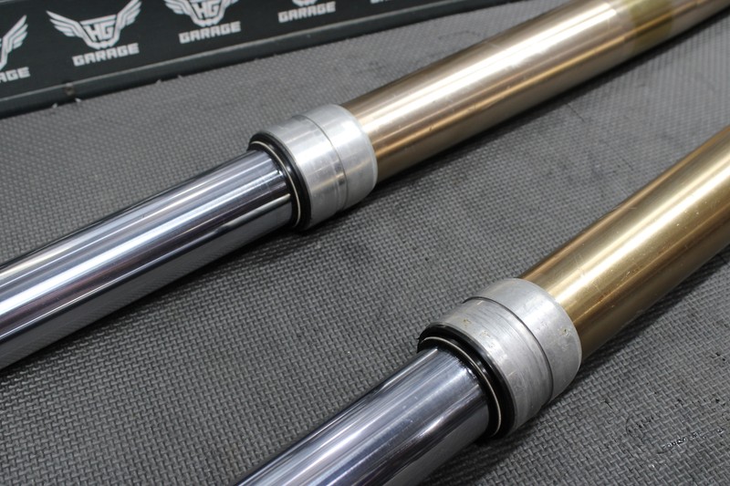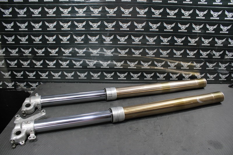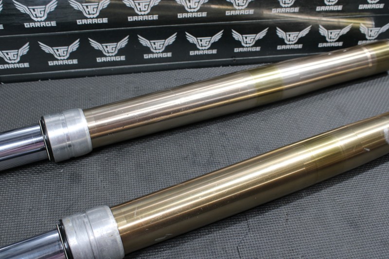 This front fork set is in very good condition and shows normal signs of wear. Good dampening, and rebound. Both forks function nicely, however left fork seal appeared to wheep very lightly when tested, and is recommended both forks be serviced before installed for optimal performance. Lower chrome tubes in nice shape, some light surface scratches, and pit marks that can barely be felt as shown. Upper fork tubes in nice shape, some light wear marks nothing major or excessive. All threaded holes fully intact. Ready to bolt up and ride.