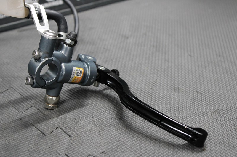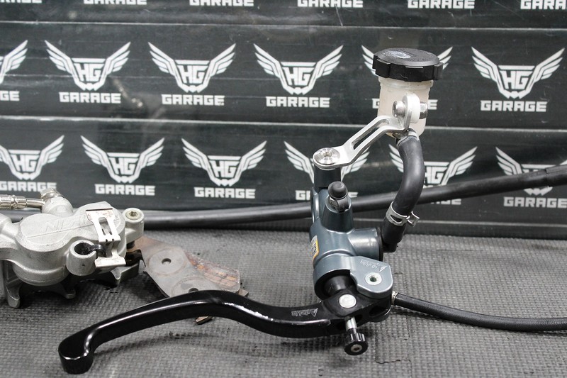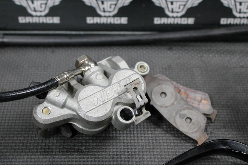 This front caliper is in very good condition and shows normal signs of wear. Brake functions as it should with no leaks or issues. Has a nice aftermarket master cylinder installed for optimal braking performance. Caliper mounting bracket, and hardware not included. Nice steel braided brake line. Ready to assemble, and ride!