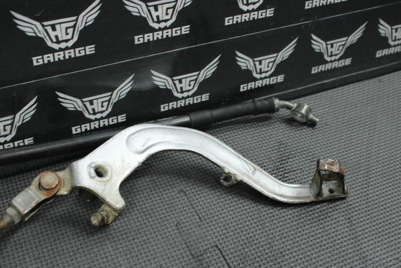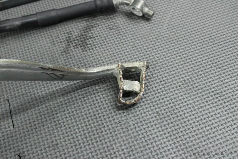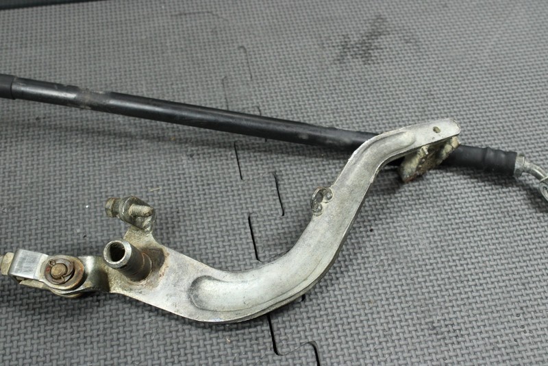 This rear master with reservoir is in good condition and shows normal signs of wear. No cracks, or repairs. Master cylinder will need to be rebuilt in order to function properly. Brake pedal has a minor bend at the tip as shown, however still mounts, and funtions properly.