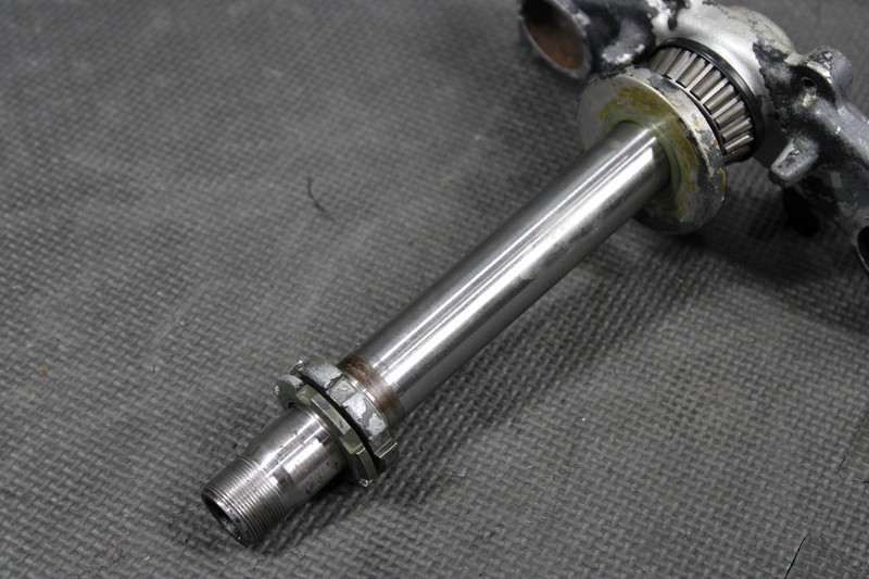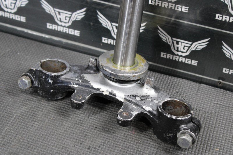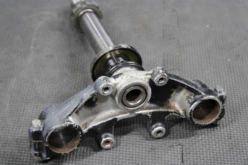This lower tree is in okay condition and shows normal signs of wear. Has one bolt broken off front right tab as shown. All other threads intact. Has been poorly painted black. Bearing in great shape no pitting, or excessive wear marks.