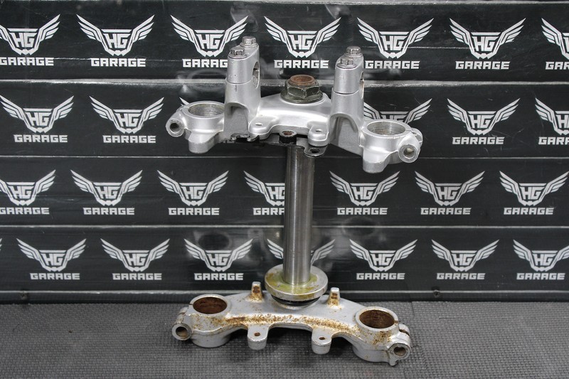 This triple tree set is in very good condition and shows normal signs of wear. Bearings will need to be replaced. All threads intact. Missing all hardware for fork clamps as shown. Ready to assemble!